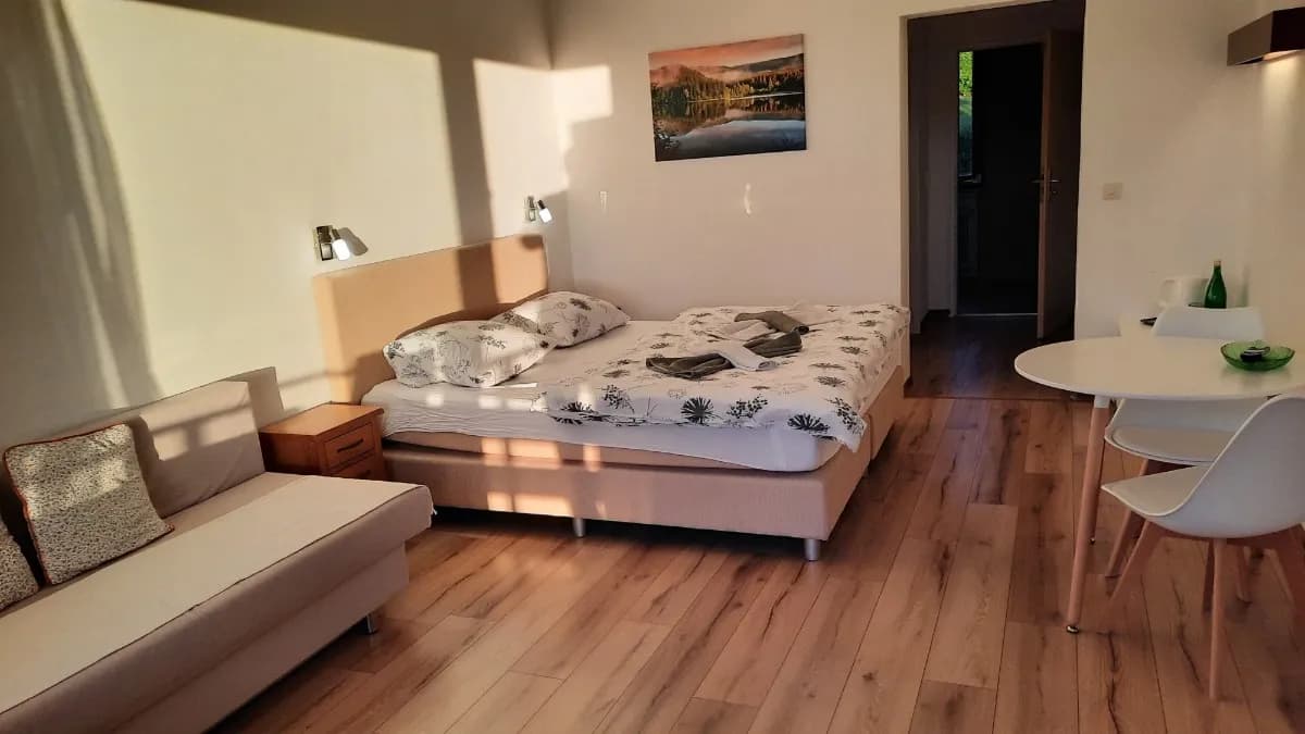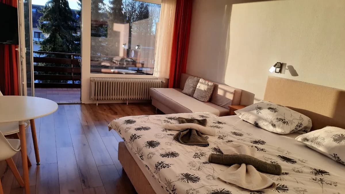 Das Hotel verfügt über gemütliche Einzel- und Doppelzimmer sowie Ferienwohnungen, die alle liebevoll eingerichtet sind. Einige Zimmer bieten Balkone mit herrlichem Blick auf die umliegende Natur. Zur Entspannung stehen ein hauseigenes Schwimmbad und eine Sauna zur Verfügung, die nach einem aktiven Tag zum Verweilen einladen.